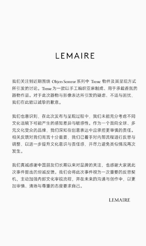 品牌初期删内容、关闭了IG评论区,1天后发文致歉“未能充分考虑文化差异与敏感性”,强调辫子是亚麻香氛挂饰、无冒犯意图。